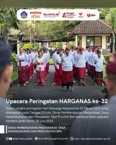 Dalam rangka peringatan Hari Keluarga Nasional ke-32 Tahun 2025 yang ditetapkan pada Tanggal 29 Juni, Dinas Pemberdayaan Masyarakat, Desa, Kependudukan dan Pencatatan Sipil Provinsi Bali melaksanakan upacara bendera pada Senin, 30 Juni 2025.